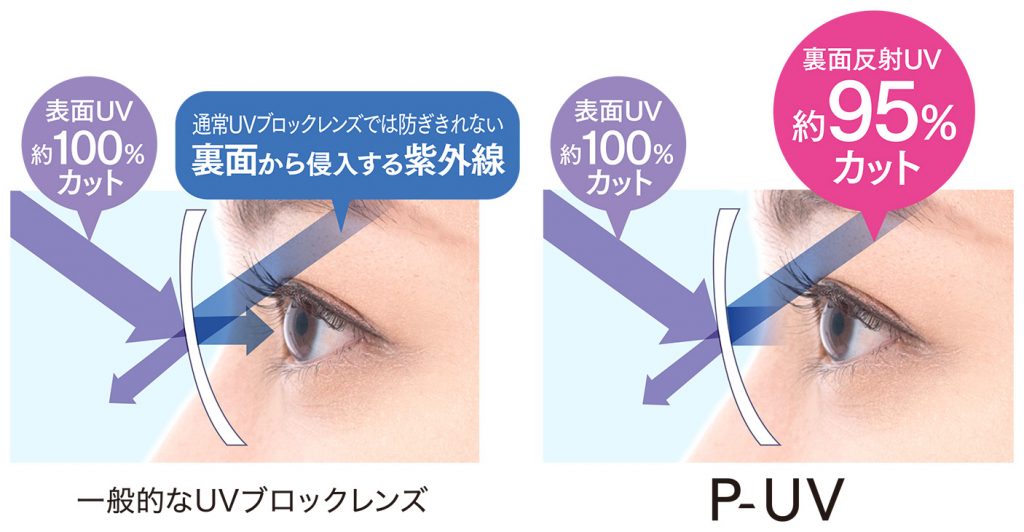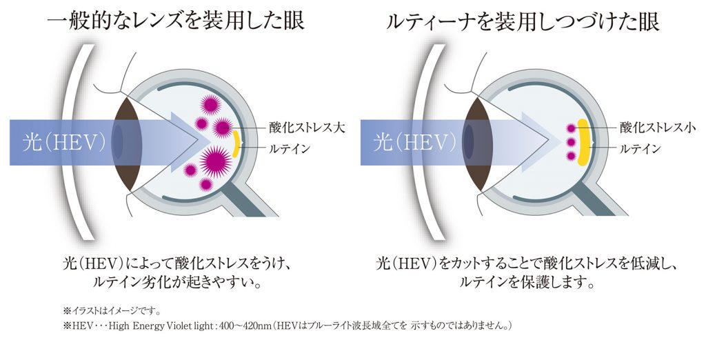 ルティーナレンズはルテイン層に影響する光「P-UV」を95%カットするレンズです。